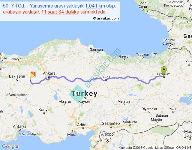 50. Yıl Cd. - Yunusemre arası yaklaşık olarak 90 km/h ile yukarıda belirtilen sürede olup, iki yerin kuş uçuşu uzaklığı (mesafesi) 832'dir. Eğer belirtilen yerler arasında uçak seferi var ise bu süre uçakla 1 saat 16 dakika'ya kadar düşebilir. Yolculuk otobüsle 15 saat 2 dakika sürmektedir.