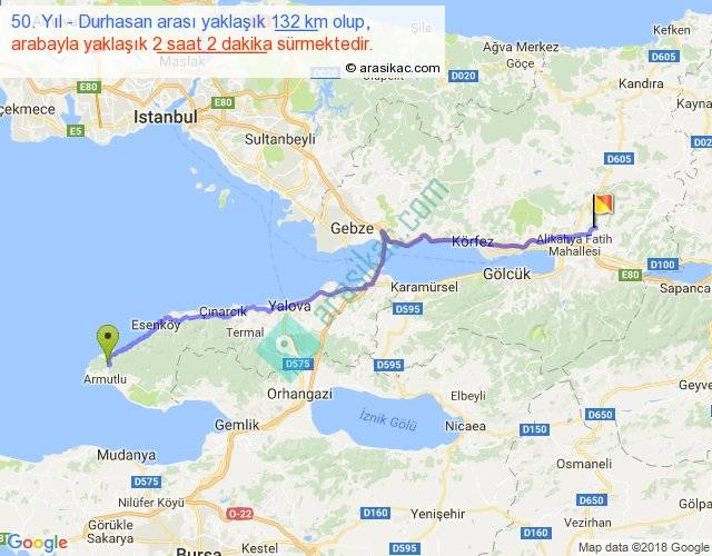 50. Yıl - Durhasan arası yaklaşık olarak 90 km/h ile yukarıda belirtilen sürede olup, iki yerin kuş uçuşu uzaklığı (mesafesi) 105'dir. Yolculuk otobüsle 2 saat 38 dakika sürmektedir.