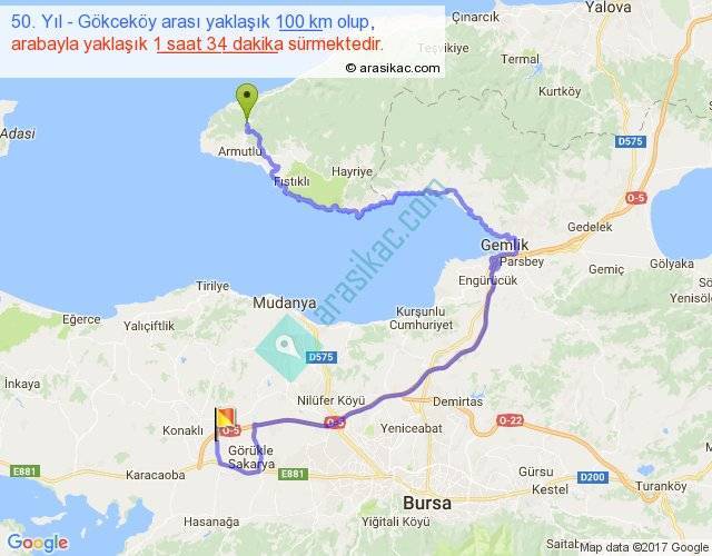 50. Yıl - Gökceköy arası yaklaşık olarak 90 km/h ile yukarıda belirtilen sürede olup, iki yerin kuş uçuşu uzaklığı (mesafesi) 33'dir. Yolculuk otobüsle 2 saat 2 dakika sürmektedir.