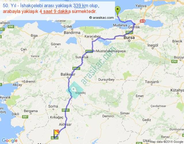 50. Yıl - İshakçelebi arası yaklaşık olarak 90 km/h ile yukarıda belirtilen sürede olup, iki yerin kuş uçuşu uzaklığı (mesafesi) 223'dir. Yolculuk otobüsle 5 saat 23 dakika sürmektedir.