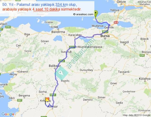 50. Yıl - Palamut arası yaklaşık olarak 90 km/h ile yukarıda belirtilen sürede olup, iki yerin kuş uçuşu uzaklığı (mesafesi) 198'dir. Yolculuk otobüsle 5 saat 25 dakika sürmektedir.