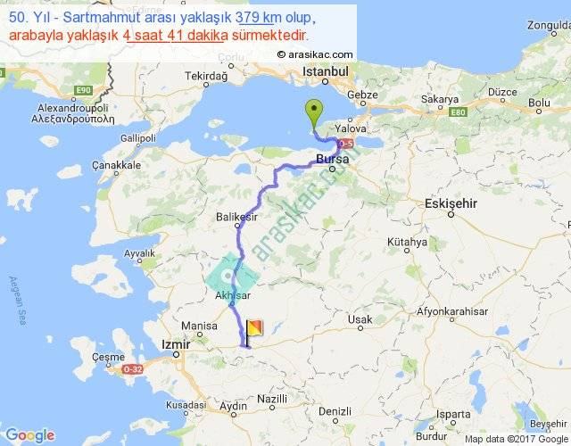 50. Yıl - Sartmahmut arası yaklaşık olarak 90 km/h ile yukarıda belirtilen sürede olup, iki yerin kuş uçuşu uzaklığı (mesafesi) 237'dir. Yolculuk otobüsle 6 saat 5 dakika sürmektedir.