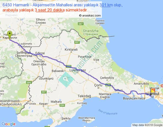 6450 Harmanlı - Akşemsettin Mahallesi arası yaklaşık olarak 90 km/h ile yukarıda belirtilen sürede olup, iki yerin kuş uçuşu uzaklığı (mesafesi) 271'dir. Eğer belirtilen yerler arasında uçak seferi var ise bu süre uçakla 25 dakika'ya kadar düşebilir. Yolculuk otobüsle 4 saat 20 dakika sürmektedir.