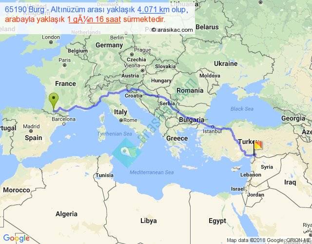 65190 Burg - Altınüzüm arası yaklaşık olarak 90 km/h ile yukarıda belirtilen sürede olup, iki yerin kuş uçuşu uzaklığı (mesafesi) 3118'dir. Eğer belirtilen yerler arasında uçak seferi var ise bu süre uçakla 4 saat 47 dakika'ya kadar düşebilir. Yolculuk otobüsle 2 gün 4 saat sürmektedir.