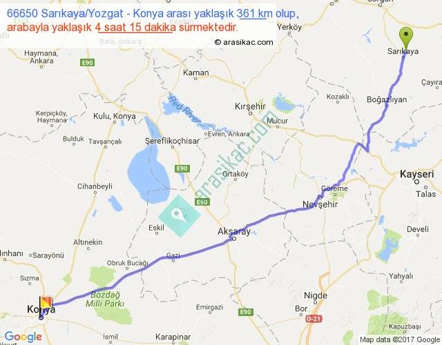 66650 Sarıkaya Yozgat - Konya arası yaklaşık olarak 90 km/h ile yukarıda belirtilen sürede olup, iki yerin kuş uçuşu uzaklığı (mesafesi) 310'dir. Eğer belirtilen yerler arasında uçak seferi var ise bu süre uçakla 28 dakika'ya kadar düşebilir. Yolculuk otobüsle 5 saat 31 dakika sürmektedir.