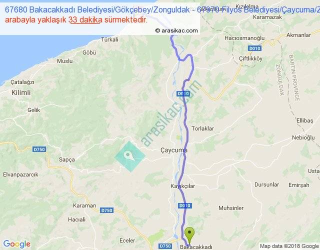 67680 Bakacakkadı Belediyesi Gökçebey Zonguldak - 67970 Filyos Belediyesi Çaycuma Zonguldak arası yaklaşık olarak 90 km/h ile yukarıda belirtilen sürede olup, iki yerin kuş uçuşu uzaklığı (mesafesi) 26'dir. Yolculuk otobüsle 42 dakika sürmektedir.