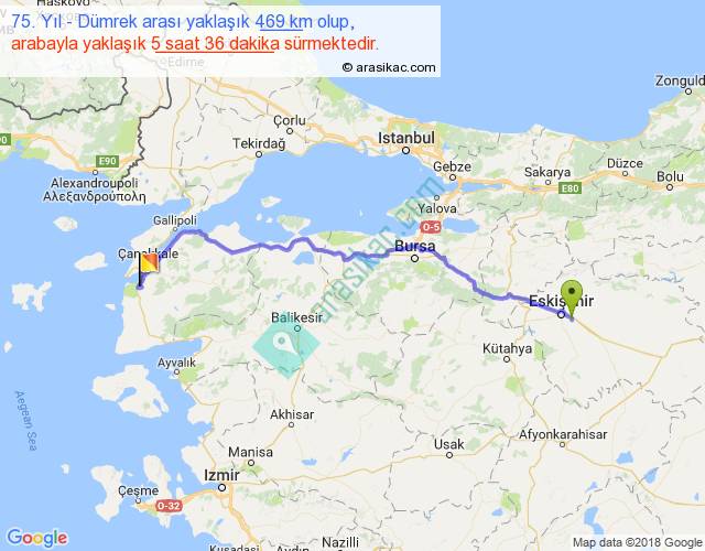 75. Yıl - Dümrek arası yaklaşık olarak 90 km/h ile yukarıda belirtilen sürede olup, iki yerin kuş uçuşu uzaklığı (mesafesi) 365'dir. Eğer belirtilen yerler arasında uçak seferi var ise bu süre uçakla 33 dakika'ya kadar düşebilir. Yolculuk otobüsle 7 saat 16 dakika sürmektedir.