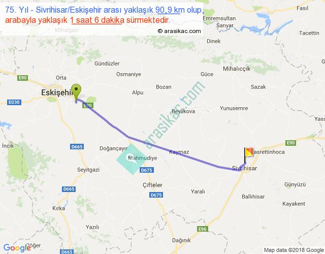 75. Yıl - Sivrihisar Eskişehir arası yaklaşık olarak 90 km/h ile yukarıda belirtilen sürede olup, iki yerin kuş uçuşu uzaklığı (mesafesi) 83'dir. Yolculuk otobüsle 1 saat 25 dakika sürmektedir.