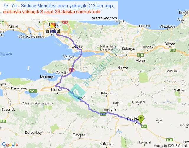 75. Yıl - Sütlüce Mahallesi arası yaklaşık olarak 90 km/h ile yukarıda belirtilen sürede olup, iki yerin kuş uçuşu uzaklığı (mesafesi) 204'dir. Yolculuk otobüsle 4 saat 40 dakika sürmektedir.