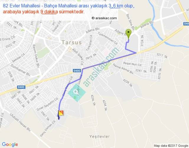 82 Evler Mahallesi - Bahçe Mahallesi arası yaklaşık olarak 90 km/h ile yukarıda belirtilen sürede olup, iki yerin kuş uçuşu uzaklığı (mesafesi) 3'dir. Yolculuk otobüsle 11 dakika sürmektedir.