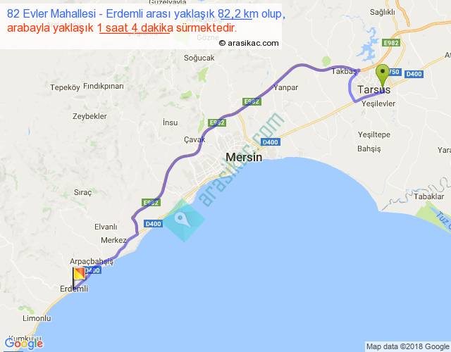 82 Evler Mahallesi - Erdemli arası yaklaşık olarak 90 km/h ile yukarıda belirtilen sürede olup, iki yerin kuş uçuşu uzaklığı (mesafesi) 63'dir. Yolculuk otobüsle 1 saat 23 dakika sürmektedir.