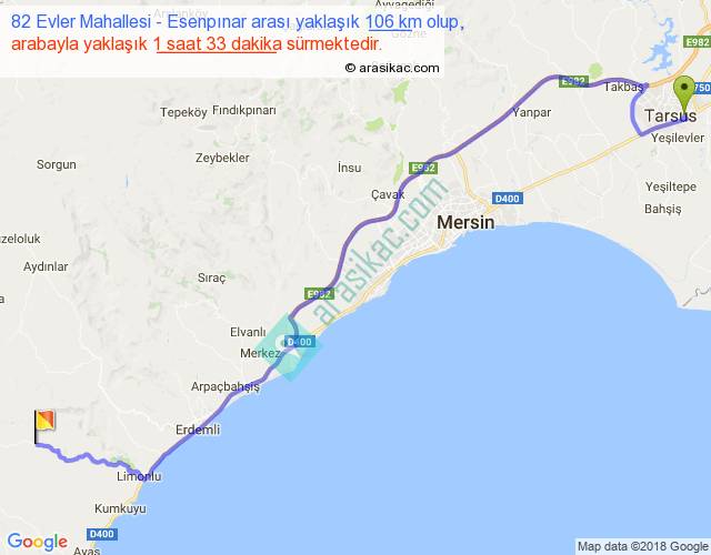 82 Evler Mahallesi - Esenpınar arası yaklaşık olarak 90 km/h ile yukarıda belirtilen sürede olup, iki yerin kuş uçuşu uzaklığı (mesafesi) 80'dir. Yolculuk otobüsle 2 saat 0 dakika sürmektedir.