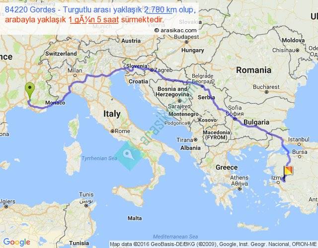 84220 Gordes - Turgutlu arası yaklaşık olarak 90 km/h ile yukarıda belirtilen sürede olup, iki yerin kuş uçuşu uzaklığı (mesafesi) 1958'dir. Eğer belirtilen yerler arasında uçak seferi var ise bu süre uçakla 3 saat 00 dakika'ya kadar düşebilir. Yolculuk otobüsle 1 gün 13 saat sürmektedir.