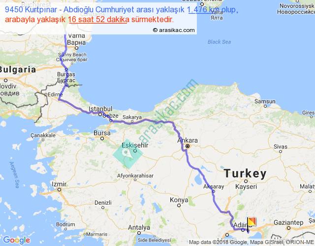 9450 Kurtpınar - Abdioğlu Cumhuriyet arası yaklaşık olarak 90 km/h ile yukarıda belirtilen sürede olup, iki yerin kuş uçuşu uzaklığı (mesafesi) 1021'dir. Eğer belirtilen yerler arasında uçak seferi var ise bu süre uçakla 1 saat 34 dakika'ya kadar düşebilir. Yolculuk otobüsle 21 saat 55 dakika sürmektedir.