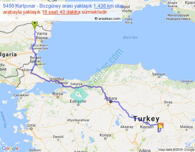 9450 Kurtpınar - Bozgüney arası yaklaşık olarak 90 km/h ile yukarıda belirtilen sürede olup, iki yerin kuş uçuşu uzaklığı (mesafesi) 960'dir. Eğer belirtilen yerler arasında uçak seferi var ise bu süre uçakla 1 saat 28 dakika'ya kadar düşebilir. Yolculuk otobüsle 21 saat 40 dakika sürmektedir.