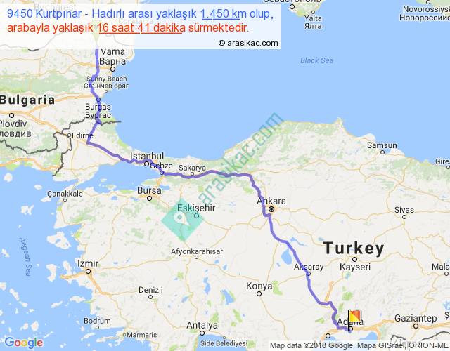 9450 Kurtpınar - Hadırlı arası yaklaşık olarak 90 km/h ile yukarıda belirtilen sürede olup, iki yerin kuş uçuşu uzaklığı (mesafesi) 1005'dir. Eğer belirtilen yerler arasında uçak seferi var ise bu süre uçakla 1 saat 32 dakika'ya kadar düşebilir. Yolculuk otobüsle 21 saat 41 dakika sürmektedir.