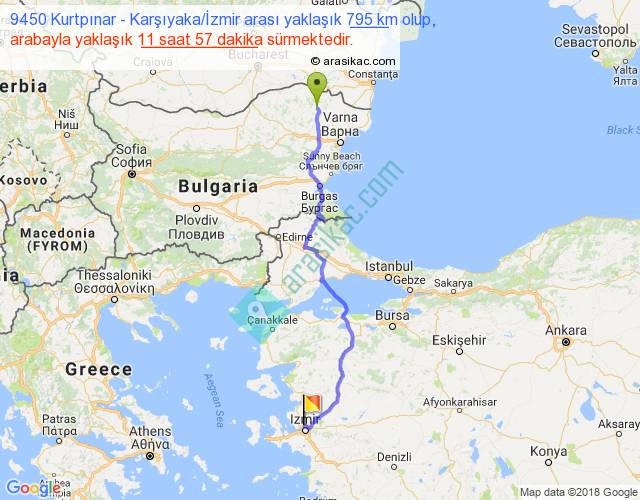 9450 Kurtpınar - Karşıyaka İzmir arası yaklaşık olarak 90 km/h ile yukarıda belirtilen sürede olup, iki yerin kuş uçuşu uzaklığı (mesafesi) 580'dir. Eğer belirtilen yerler arasında uçak seferi var ise bu süre uçakla 53 dakika'ya kadar düşebilir. Yolculuk otobüsle 15 saat 32 dakika sürmektedir.