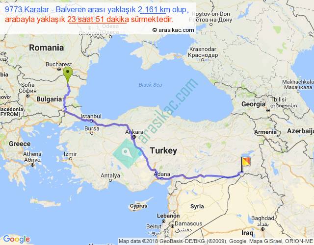 9773 Karalar - Balveren arası yaklaşık olarak 90 km/h ile yukarıda belirtilen sürede olup, iki yerin kuş uçuşu uzaklığı (mesafesi) 1470'dir. Eğer belirtilen yerler arasında uçak seferi var ise bu süre uçakla 2 saat 15 dakika'ya kadar düşebilir. Yolculuk otobüsle 1 gün 7 saat sürmektedir.