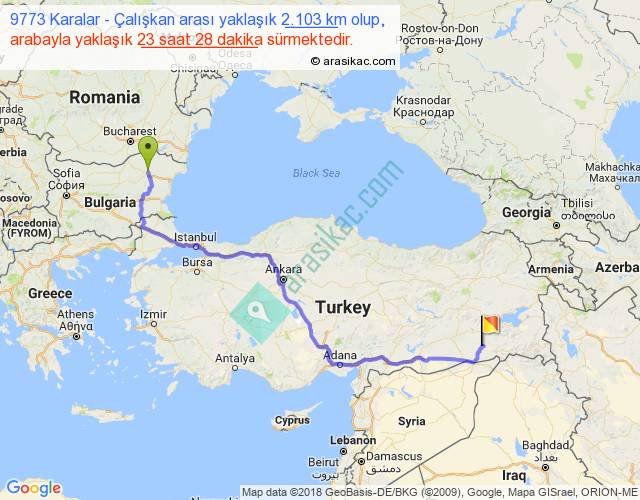 9773 Karalar - Çalışkan arası yaklaşık olarak 90 km/h ile yukarıda belirtilen sürede olup, iki yerin kuş uçuşu uzaklığı (mesafesi) 1392'dir. Eğer belirtilen yerler arasında uçak seferi var ise bu süre uçakla 2 saat 08 dakika'ya kadar düşebilir. Yolculuk otobüsle 1 gün 6 saat sürmektedir.