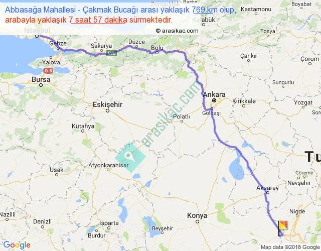 Abbasağa Mahallesi - Çakmak Bucağı arası yaklaşık olarak 90 km/h ile yukarıda belirtilen sürede olup, iki yerin kuş uçuşu uzaklığı (mesafesi) 589'dir. Eğer belirtilen yerler arasında uçak seferi var ise bu süre uçakla 54 dakika'ya kadar düşebilir. Yolculuk otobüsle 10 saat 20 dakika sürmektedir.