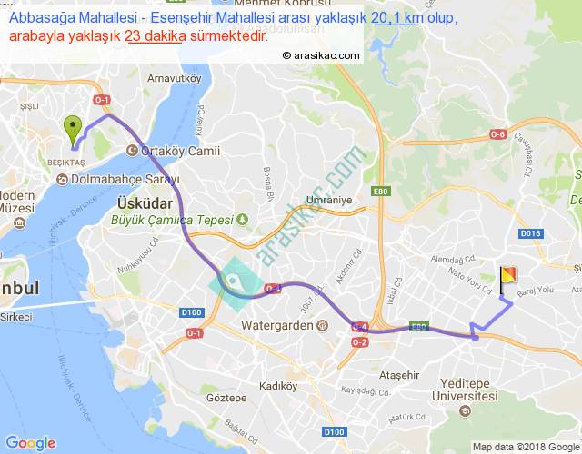 Abbasağa Mahallesi - Esenşehir Mahallesi arası yaklaşık olarak 90 km/h ile yukarıda belirtilen sürede olup, iki yerin kuş uçuşu uzaklığı (mesafesi) 14'dir. Yolculuk otobüsle 29 dakika sürmektedir.