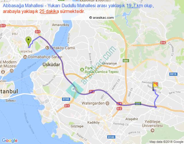 Abbasağa Mahallesi - Yukarı Dudullu Mahallesi arası yaklaşık olarak 90 km/h ile yukarıda belirtilen sürede olup, iki yerin kuş uçuşu uzaklığı (mesafesi) 13'dir. Yolculuk otobüsle 32 dakika sürmektedir.