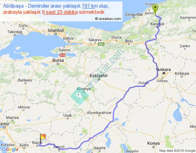 Abdipaşa - Demirciler arası yaklaşık olarak 90 km/h ile yukarıda belirtilen sürede olup, iki yerin kuş uçuşu uzaklığı (mesafesi) 525'dir. Eğer belirtilen yerler arasında uçak seferi var ise bu süre uçakla 48 dakika'ya kadar düşebilir. Yolculuk otobüsle 12 saat 11 dakika sürmektedir.