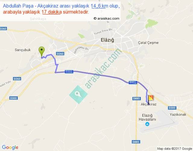 Abdullah Paşa - Akçakiraz arası yaklaşık olarak 90 km/h ile yukarıda belirtilen sürede olup, iki yerin kuş uçuşu uzaklığı (mesafesi) 11'dir. Yolculuk otobüsle 22 dakika sürmektedir.