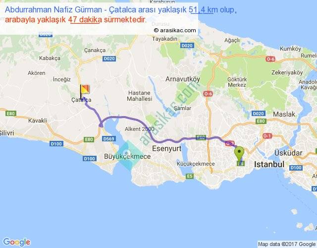 Abdurrahman Nafiz Gürman - Çatalca arası yaklaşık olarak 90 km/h ile yukarıda belirtilen sürede olup, iki yerin kuş uçuşu uzaklığı (mesafesi) 39'dir. Yolculuk otobüsle 1 saat 1 dakika sürmektedir.