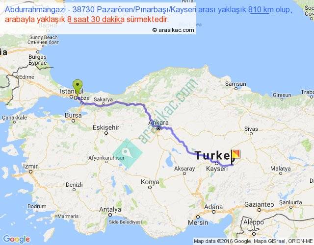 Abdurrahmangazi - 38730 Pazarören Pınarbaşı Kayseri arası yaklaşık olarak 90 km/h ile yukarıda belirtilen sürede olup, iki yerin kuş uçuşu uzaklığı (mesafesi) 643'dir. Eğer belirtilen yerler arasında uçak seferi var ise bu süre uçakla 59 dakika'ya kadar düşebilir. Yolculuk otobüsle 11 saat 3 dakika sürmektedir.