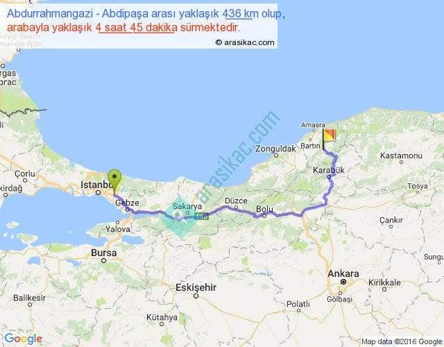 Abdurrahmangazi - Abdipaşa arası yaklaşık olarak 90 km/h ile yukarıda belirtilen sürede olup, iki yerin kuş uçuşu uzaklığı (mesafesi) 283'dir. Eğer belirtilen yerler arasında uçak seferi var ise bu süre uçakla 26 dakika'ya kadar düşebilir. Yolculuk otobüsle 6 saat 10 dakika sürmektedir.
