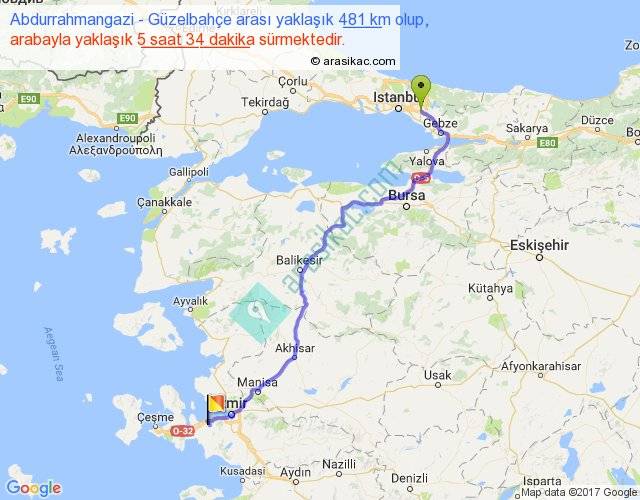 Abdurrahmangazi - Güzelbahçe arası yaklaşık olarak 90 km/h ile yukarıda belirtilen sürede olup, iki yerin kuş uçuşu uzaklığı (mesafesi) 354'dir. Eğer belirtilen yerler arasında uçak seferi var ise bu süre uçakla 32 dakika'ya kadar düşebilir. Yolculuk otobüsle 7 saat 14 dakika sürmektedir.