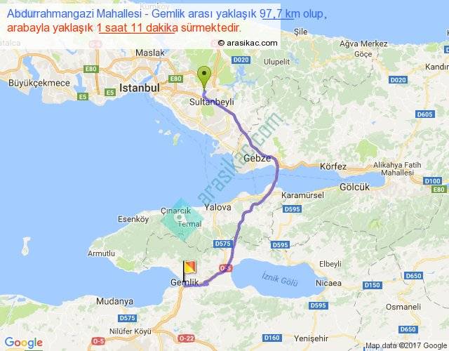 Abdurrahmangazi Mahallesi - Gemlik arası yaklaşık olarak 90 km/h ile yukarıda belirtilen sürede olup, iki yerin kuş uçuşu uzaklığı (mesafesi) 63'dir. Yolculuk otobüsle 1 saat 32 dakika sürmektedir.
