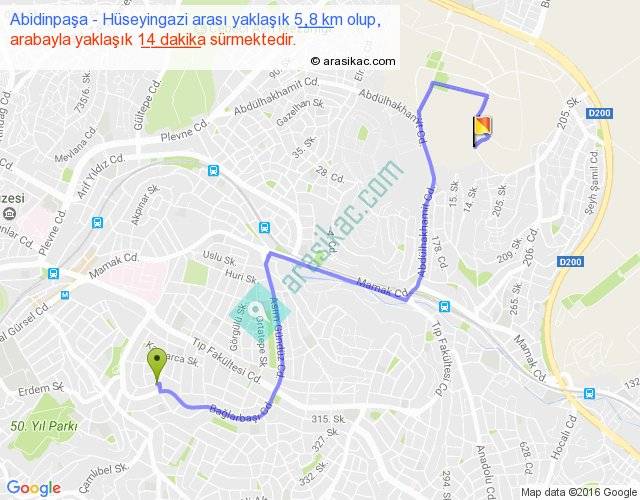 Abidinpaşa - Hüseyingazi arası yaklaşık olarak 90 km/h ile yukarıda belirtilen sürede olup, iki yerin kuş uçuşu uzaklığı (mesafesi) 3'dir. Yolculuk otobüsle 18 dakika sürmektedir.