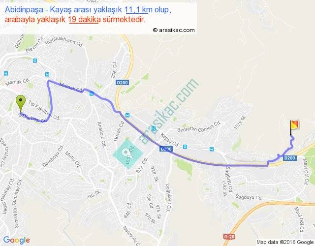 Abidinpaşa - Kayaş arası yaklaşık olarak 90 km/h ile yukarıda belirtilen sürede olup, iki yerin kuş uçuşu uzaklığı (mesafesi) 8'dir. Yolculuk otobüsle 24 dakika sürmektedir.