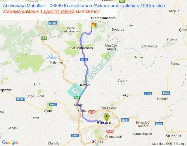 Abidinpaşa Mahallesi - 06890 Kızılcahamam Ankara arası yaklaşık olarak 90 km/h ile yukarıda belirtilen sürede olup, iki yerin kuş uçuşu uzaklığı (mesafesi) 74'dir. Yolculuk otobüsle 2 saat 11 dakika sürmektedir.