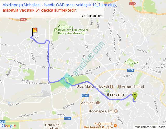 Abidinpaşa Mahallesi - İvedik OSB arası yaklaşık olarak 90 km/h ile yukarıda belirtilen sürede olup, iki yerin kuş uçuşu uzaklığı (mesafesi) 14'dir. Yolculuk otobüsle 40 dakika sürmektedir.