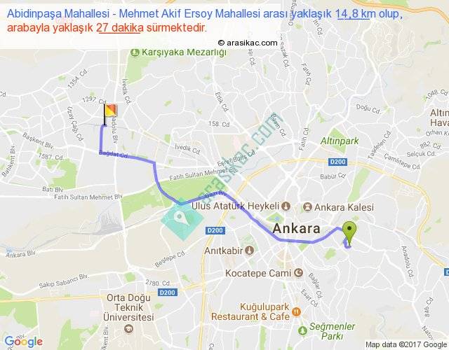Abidinpaşa Mahallesi - Mehmet Akif Ersoy Mahallesi arası yaklaşık olarak 90 km/h ile yukarıda belirtilen sürede olup, iki yerin kuş uçuşu uzaklığı (mesafesi) 11'dir. Yolculuk otobüsle 35 dakika sürmektedir.