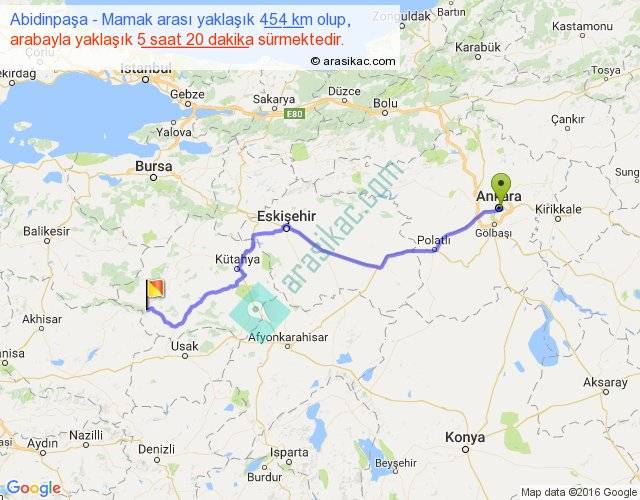 Abidinpaşa - Mamak arası yaklaşık olarak 90 km/h ile yukarıda belirtilen sürede olup, iki yerin kuş uçuşu uzaklığı (mesafesi) 345'dir. Eğer belirtilen yerler arasında uçak seferi var ise bu süre uçakla 31 dakika'ya kadar düşebilir. Yolculuk otobüsle 6 saat 56 dakika sürmektedir.