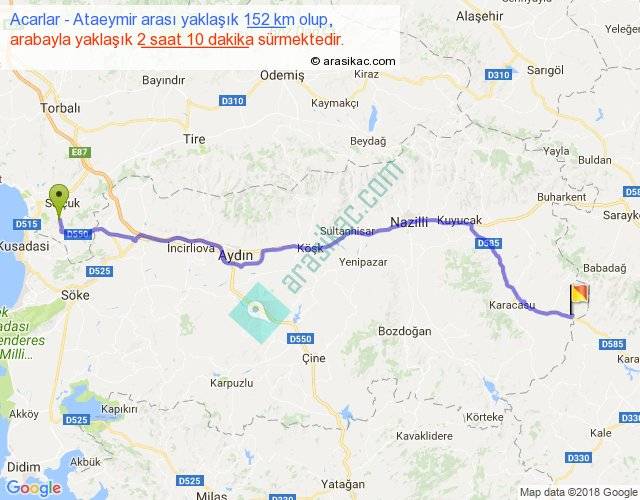 Acarlar - Ataeymir arası yaklaşık olarak 90 km/h ile yukarıda belirtilen sürede olup, iki yerin kuş uçuşu uzaklığı (mesafesi) 125'dir. Yolculuk otobüsle 2 saat 49 dakika sürmektedir.
