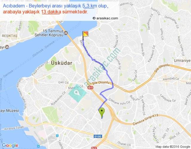 Acıbadem - Beylerbeyi arası yaklaşık olarak 90 km/h ile yukarıda belirtilen sürede olup, iki yerin kuş uçuşu uzaklığı (mesafesi) 4'dir. Yolculuk otobüsle 16 dakika sürmektedir.