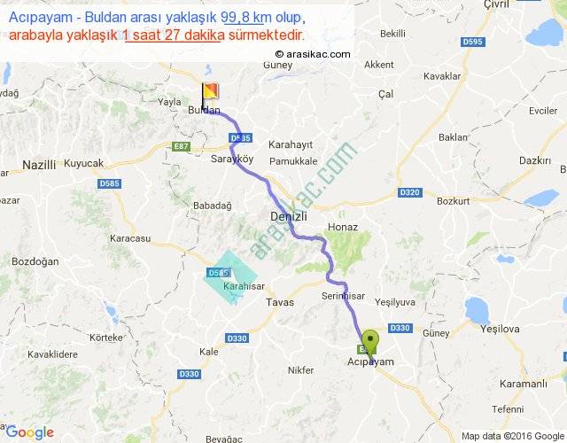 Acıpayam - Buldan arası yaklaşık olarak 90 km/h ile yukarıda belirtilen sürede olup, iki yerin kuş uçuşu uzaklığı (mesafesi) 82'dir. Yolculuk otobüsle 1 saat 53 dakika sürmektedir.