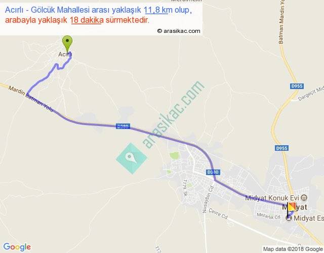 Acırlı - Gölcük Mahallesi arası yaklaşık olarak 90 km/h ile yukarıda belirtilen sürede olup, iki yerin kuş uçuşu uzaklığı (mesafesi) 8'dir. Yolculuk otobüsle 23 dakika sürmektedir.