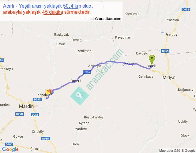 Acırlı - Yeşilli arası yaklaşık olarak 90 km/h ile yukarıda belirtilen sürede olup, iki yerin kuş uçuşu uzaklığı (mesafesi) 44'dir. Yolculuk otobüsle 58 dakika sürmektedir.