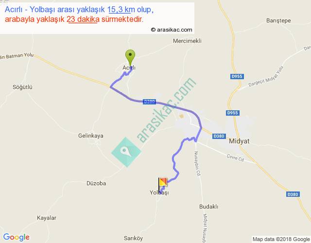 Acırlı - Yolbaşı arası yaklaşık olarak 90 km/h ile yukarıda belirtilen sürede olup, iki yerin kuş uçuşu uzaklığı (mesafesi) 8'dir. Yolculuk otobüsle 29 dakika sürmektedir.