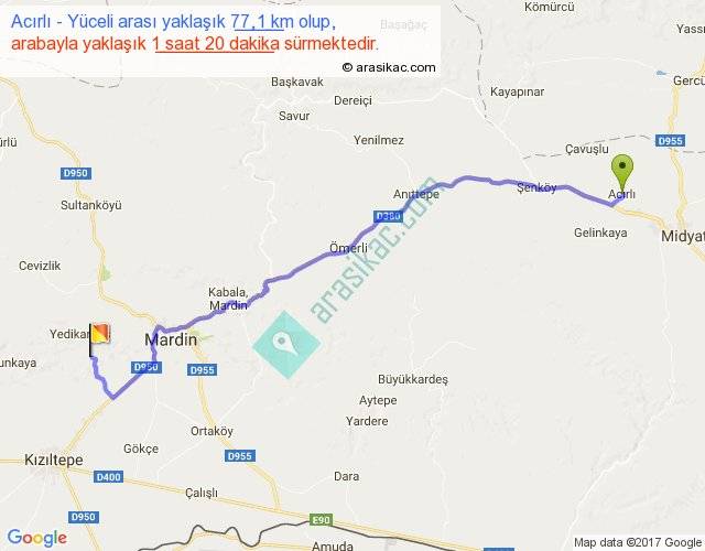 Acırlı - Yüceli arası yaklaşık olarak 90 km/h ile yukarıda belirtilen sürede olup, iki yerin kuş uçuşu uzaklığı (mesafesi) 61'dir. Yolculuk otobüsle 1 saat 44 dakika sürmektedir.
