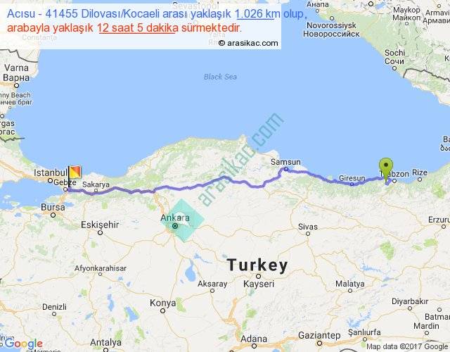 Acısu - 41455 Dilovası Kocaeli arası yaklaşık olarak 90 km/h ile yukarıda belirtilen sürede olup, iki yerin kuş uçuşu uzaklığı (mesafesi) 825'dir. Eğer belirtilen yerler arasında uçak seferi var ise bu süre uçakla 1 saat 16 dakika'ya kadar düşebilir. Yolculuk otobüsle 15 saat 42 dakika sürmektedir.