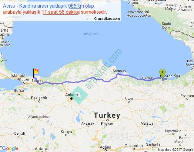 Acısu - Kandıra arası yaklaşık olarak 90 km/h ile yukarıda belirtilen sürede olup, iki yerin kuş uçuşu uzaklığı (mesafesi) 776'dir. Eğer belirtilen yerler arasında uçak seferi var ise bu süre uçakla 1 saat 11 dakika'ya kadar düşebilir. Yolculuk otobüsle 15 saat 30 dakika sürmektedir.
