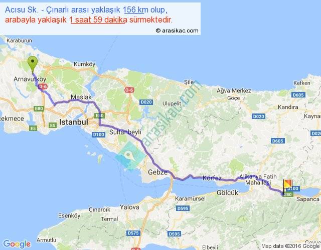 Acısu Sk. - Çınarlı arası yaklaşık olarak 90 km/h ile yukarıda belirtilen sürede olup, iki yerin kuş uçuşu uzaklığı (mesafesi) 127'dir. Yolculuk otobüsle 2 saat 34 dakika sürmektedir.
