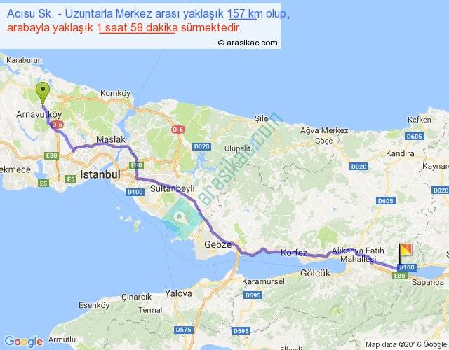 Acısu Sk. - Uzuntarla Merkez arası yaklaşık olarak 90 km/h ile yukarıda belirtilen sürede olup, iki yerin kuş uçuşu uzaklığı (mesafesi) 128'dir. Yolculuk otobüsle 2 saat 33 dakika sürmektedir.